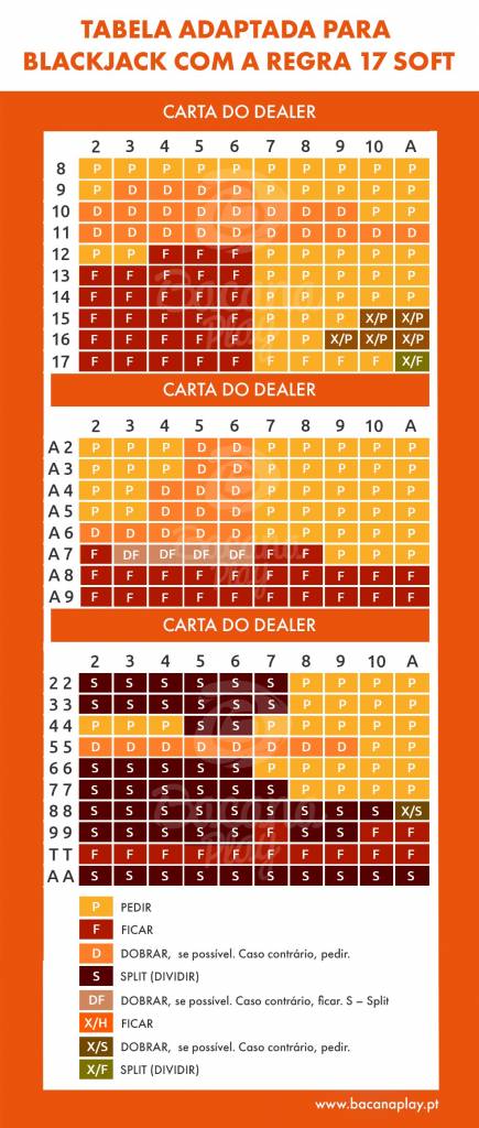 Na verdade, existem duas tabelas predominantes para os jogadores de blackjack: uma para as variantes onde o dealer é obrigado a ficar com 17 soft, outra para as mesas onde o dealer é obrigado a pedir com 17 soft. As duas tabelas diferem, essencialmente, na decisão a tomar perante a possibilidade de o dealer atingir um 17 soft.