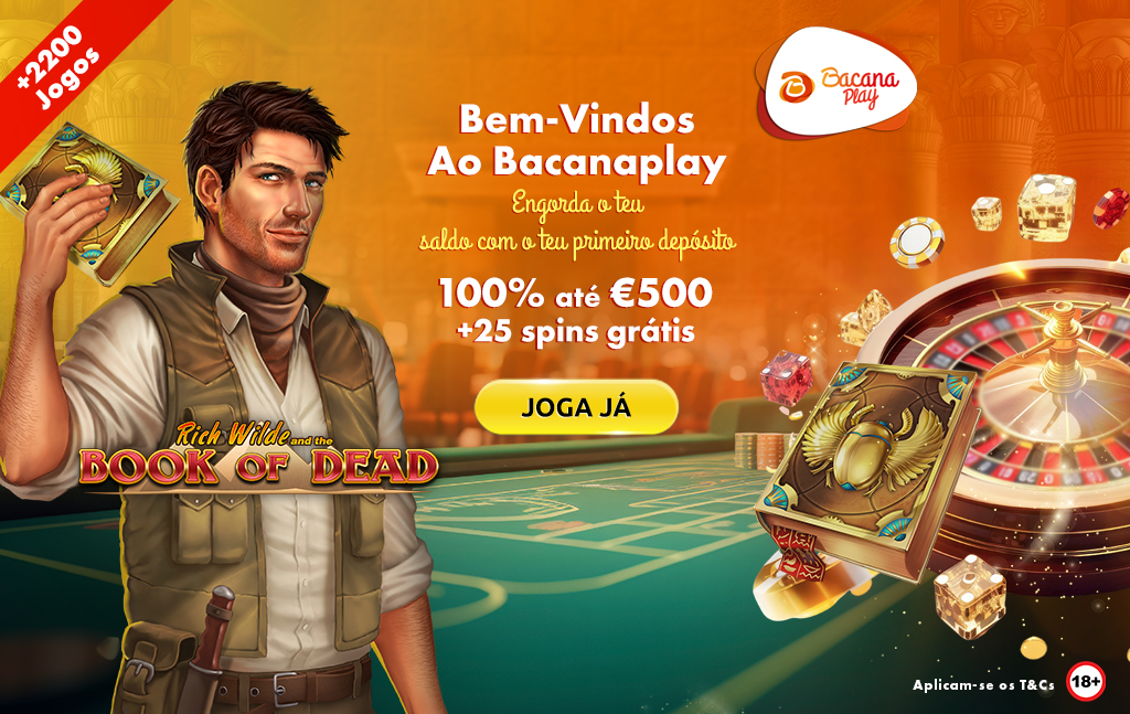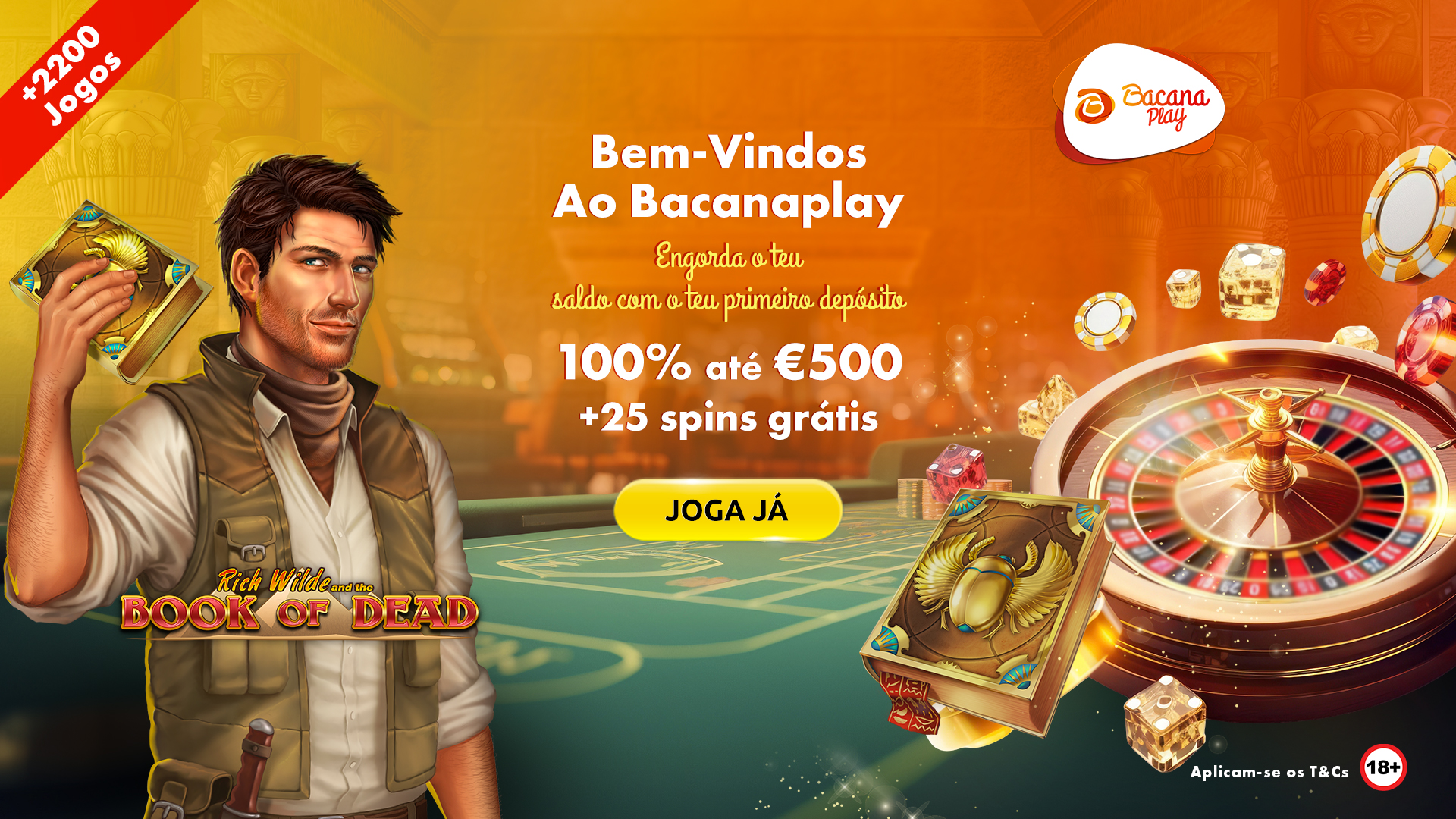 Só para o Primeiro Depósito. Depósito mín.: €10, Bónus máx.: €500. Jogo: Riche Wilde and the Book of Dead, Valor da Spin: €0.10. Aposta de 30x o montante de Bónus e 60x o montante dos ganhos com as spins grátis (só contam as slots) em 30 dias. A aposta máxima é de 10% (mín. €0.10) do montante dos ganhos com as spins grátis e bónus ou €5 (aplica-se o montante que for inferior). As spins devem ser utilizadas e/ou os bónus devem ser reivindicados antes de utilizares os fundos depositados. O Depósito/Bónus de boas-vindas só pode ser reivindicado uma vez a cada 72 horas em todos os Casinos. Esta oferta está disponível apenas para jogadores específicos que foram selecionados pelo BacanaPlay. Se não chegaste a esta página através da oferta mencionada via BacanaPlay, não serás elegível para a oferta. Aplica-se a Política de Bónus.