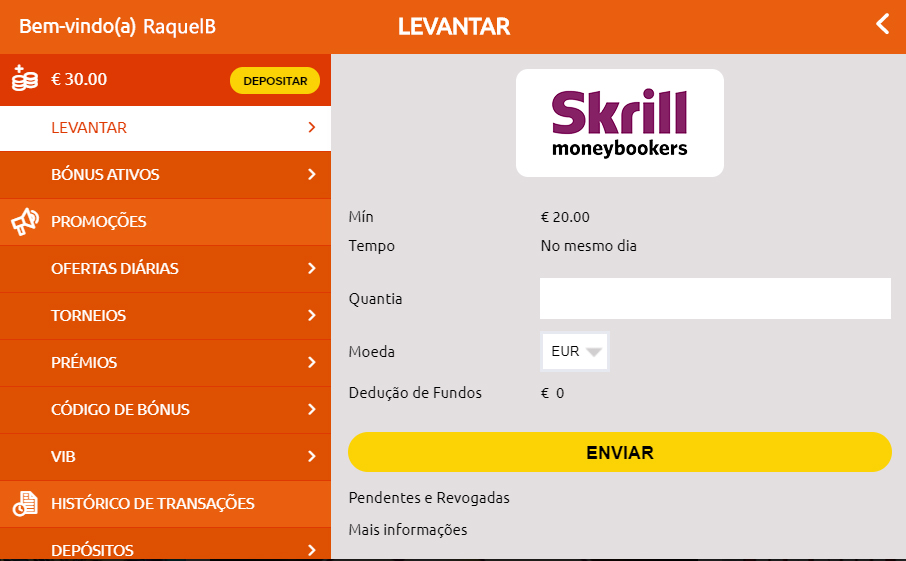 Se escolheres o Skrill para levantar o teu saldo do Bacana: