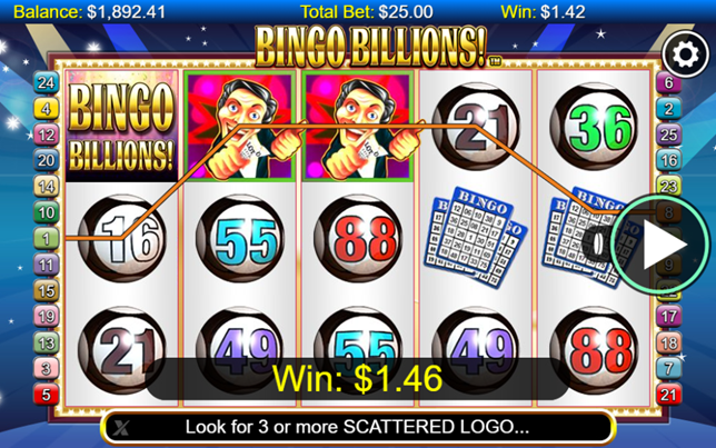 Pelo lado positivo, a slot Bingo Billions permite-te apostar tão pouco quanto 1 cêntimo por spin, se optares por apostar o mínimo em apenas uma linha de pagamentos. É como se, numa sala de bingo, pudesses escolher o preço do teu cartão e o prémio de bingo ou de linha variasse em função do valor que tinhas pago pelo cartão. Entre 0,01 moedas numa única linha de pagamentos – aposta mínima de 1 cêntimo – e 10 moedas em todas as 25 linhas de pagamentos – aposta máxima de 250 – podes ajustar o preço do teu cartão (spin) como bem te apetecer. O que faz da Bingo Billions uma slot perfeita tanto para jogadores de altas paradas como para aqueles que querem apenas dar uma oportunidade aos poucos cêntimos que lhes restem no saldo.