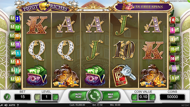 Ou seja, na Piggy Riches o valor de cada moeda pode começar desde 0,01 e ir até 0,50 por cada uma das 15 linhas. Ficas desde já a saber que as linhas são fixas e em cada spin tens de apostar em todas em 15. Mas com o valor mínimo de aposta permitido nesta slot, no Nível 1, isso significa uma aposta de meramente 0,15 moedas por spin.