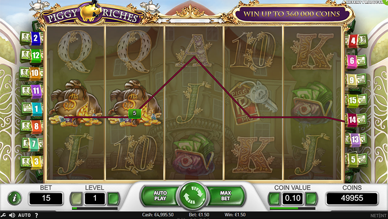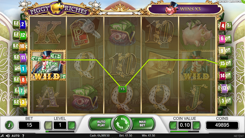 Ou seja, na Piggy Riches o valor de cada moeda pode começar desde 0,01 e ir até 0,50 por cada uma das 15 linhas. Ficas desde já a saber que as linhas são fixas e em cada spin tens de apostar em todas em 15. Mas com o valor mínimo de aposta permitido nesta slot, no Nível 1, isso significa uma aposta de meramente 0,15 moedas por spin.